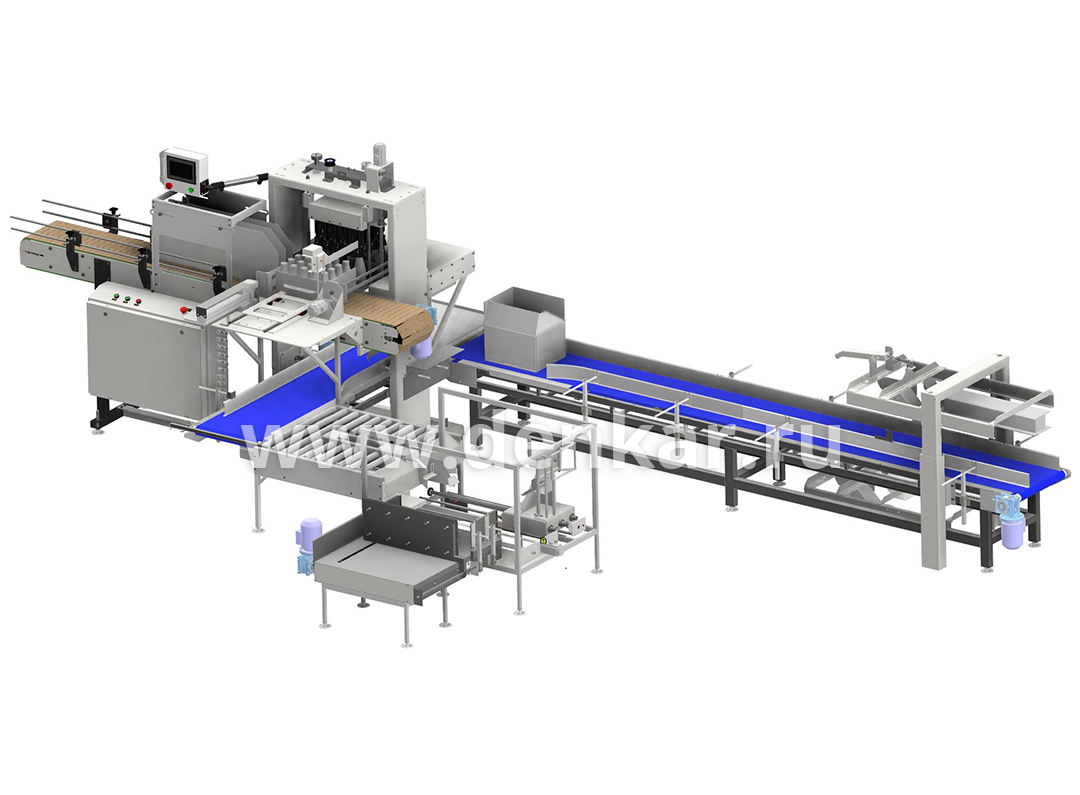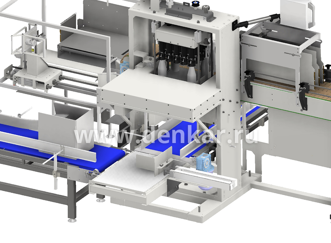 - Автоматический группиратор ПЭТ бутылок последовательного приема с перпендикулярным ходом группирования, с раздвижной головкой загрузки, с конфигурацией 4 ряда по 5 бутылок ф69 мм на один короб