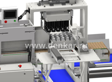 4. Загрузка продукции в короба: Сформированные короба автоматически переходят на следующий этап производственного цикла, где происходит их заполнение. Продукция накапливается на верхнем подающем конвейере, затем с помощью отсекателя и толкателя формируется необходимая группа, которая перемещается в зону вакуумного захвата. С помощью захвата и смещения пневматического стола осуществляется загрузка продукции в сформированную коробку.